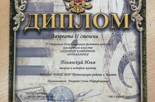 IV Республиканский фестиваль-конкурс музыкального исполнительства "Золотой камертон" номинация теории и истории музыки - Лауреаты II степени - Курмаева Камиля, Галиахметова Мадина, Алсолйеман Малика, преп. Белозерова В.С.; в номинации "Теория и истоия музыки" - Полянский Илья - Лауреат II степени, преп. Бакирова Г.Ш. -