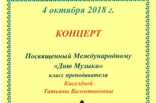 4 октября 2018 года в ДМШ 20 состоитя концерт, посвященный Дню Музыки, в котором примут участие учащиеся класса фортепиано преподавателя Киселёвой Татьяны Валентиновны.