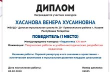 Победитель (1 место) в номинации: Творческие работы и учебно-методические разработки педагогов - Хасанова В.Х. преподаватель ДМШ № 20