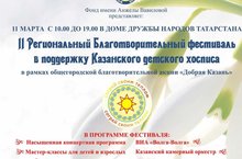 11 марта в Доме Дружбы народов Татарстана (г. Казань, ул. Павлюхина, д.57) прошел II Региональный благотворительный фестиваль «Согрей своим теплом» в пользу Казанского детского хосписа. Фестиваль проводится в рамках общегородской благотворительной акции «Добрая Казань» в целях сбора средств на нужды пациентов хосписа и привлечения внимания общественности к проблемам тяжелобольных детей.Организаторами фестиваля выступают Фонд им. Анжелы Вавиловой при поддержке региональной общественной организации «Русское национально-культурное объединение Республики Татарстан».На фестивале приняли участие учащиеся нашей музыкальной школы: "Ансамбль скрипачей" (рук.Емельянов С.В., Миннахметова Л.Р.), Капелла мальчиков (рук.Железнов Д.И.), Детский эстрадный хор "Солнечная дорога" (рук.Галлямова М.А.), Хореографичксий коллектив "Кристалл"(рук.Щербакова К.Е.), Аскарова Азалия (преп.Сулейманова Р.И.)