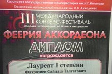 21.02.2016 прошел III Международный конкурс-фестиваль молодых исполнителей на баяне и аккордеоне "Феерия аккордеона". В конкурсе принял участие как исполнитель наш преподаватель Фахразиев Зульфат Талгатович. По итогам конкурса он стал Лауреатом I степени.Поздравляем и желаем дальнейших творческих успехов!!!