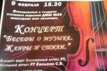 9 февраля 2016 г. преподаватели и учащиеся струнного отделения ДМШ № 20 провели концерт "Беседы о музыке. Жанры и стили". В концерте приняли участие преподаватели ДМШ № 20: Емельянов С. В., Миннахметова Л. Р., Глухова Е. Е., Настаушева Л. Г., Хлёсткина С. М., Фахразиев З. Т. Были исполнены произведения А. Вивальди, А. Гайдна, Л. Бетховена В. А. Моцарта, Ф. Крейслера,Т. Баклановой, А. Рубинштейна, К. Сен-Санс. Ведущие концерта: Заслуженный артист РТ, Народный артист РТ, преподаватель ДМШ № 20 Емельянов С. В. и преподаватель ДМШ № 20 Калёнова А. В. познакомили присутствующих с основными жанрами и стилями музыкального искусства.