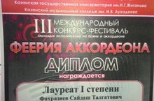 21.02.2016 года прошел III Международный конкурс -фестиваль молодых исполнителей на баяне и аккордеоне "Феерия аккордеона". В конкурсе принимал участие как исполнитель преподаватель нашей школы Фахразиев Сайдаш Талгатович. По итогам конкурса он стал Лауреатом I степени. Поздравляем!!!!
