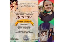 Поздравляем с успехом и победой в X Открытом Республиканском конкурсе детского, юношеского и взрослого творчества им.В.Гизатуллиной - Рахимуллину Амиру - ученицу 2 класса ДМШ №20, творческая мастерская преподавателя эстрадного вокала Венеры Хусаиновны Хасановой