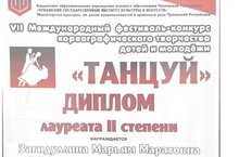 Ученица хореографического коллектива "Кристалл" Загидуллина Марьям награждена Дипломом Лауреата II степени за победу в VII Международном фестивале-конкурсе хореографического творчества детей и молодежи "Танцуй".