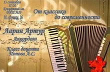 Сегодня в нашей школе прошёл концерт замечательных музыкантов: выпускника ДМШ №20 Ларина Артура (класс преподааателя Рахматуллиной Л.Р.), а теперь - студента 3 курса КГК им.Н.Г.Жиганова и трио баянистов консерватории: (ассистенты-стажёры и преподаватель Фахразиев С.Т.). Директор школы, Мария Александровна представила участников концерта и пожелала ВСЕМ ТВОРЧЕСКОГО настроения. Зрители слушали с восторгом и восхищением принимали исполнение баянистов. Начали учебный год необычно!