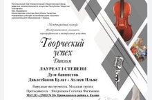Поздравляем с победой в Международном конкурсе "Творческий успех" дуэт баянистов Давлетбакова Булата и Аглеева Ильяса - награждены Дипломом лауреатов 1 степени, преподаватель Фахразиева Гелчачак Фагимовна!