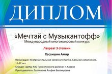 Успех учащегося ДМШ20 Хасаншина Амира на конкурсе, класс преподавателя Галлямовой А.Б.
