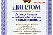 Рахматуллина Л.Р. - Лауреат I ст. с докладом "Музыкально-эстетическое воспитание детей на современном этапе"