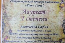 Поздравояем учащуюся класса преп. Мубараковой Ш.Т. - Зворыгина С. - Лауреат I ст.