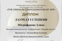 Поздравляем учащуюся класса преп. Хасановой В.Х. - Митрофанову А. - Лауреат I ст. Международного конкурса-фестиваля "THE KREMLIN CONFEDERATION OF ART" И Лауреат II ст. Международного конкурса искусств "MUSIC FORUM"