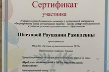 Сертификат участника - Шаехова Р.Р. Открытого Республиканского семинара с публикацией материалов "Формирование банка методических практик - основа диверсификационной стратегии развития дополнительного образования". Публикация стать на тему : "Проблемы обучения детей с ОВЗ в дополнительном образовании"