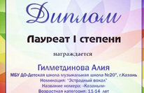 Звёздный дождь побед учащихся ДМШ № 20 в IV Международном конкурсе музыкального исполнительства "KAZAN-MUSIC ЙОРТ" - преп. ДМШ № 20 - Иляева С.Ф. - Лауреат II ст., Сертификат участника мастер-класса доцента кафедры эстрадно-джазовой музыки, кандидата философских наук КГИК- А.Р. Вознесенской "Базовый уровень осовения вокальной техники начинающего" в рамках IV Международного конкурса музыкального исполнительства "KAZAN-MUSIC ЙОРТ" ;Поймалин Э. - Дипломант I ст., Дуэт: Полянский И., Поймаин Э. - Дипломант II ст., Полянский И. - Лауреат III ст., преп. Иляева С.Ф., Силантьева Д. - Дипломант II ст., преп. Гиниятуллина Л.М.преп. ДМШ № 20 - Фатыхова Р.И. - Лауреат II ст., Сертификат участия в мастер-классе старшего преподавателя кафедры музыкально- инструментального исполнительства КГИК М.М. Нагорнова " Некоторые аспекты подбора аппликатуры в произведениях для классической гитары" в рамках IV Международного конкурса музыкального исполнительства "KAZAN-MUSIC ЙОРТ"Гиниятуллина Л.М. -Сертификат участника Мастер-класса старшего преподавателя кафедры музыкально-инструментального исполнительства КГИК Н.Ф. Сагдиева "Формирование навыков подбора по слуху в сольном исполнительстве и аккомпанементе на баяне"Полянский И. - Лауреат II ст., преп. Оськин М.Е., конц. Хлесткина С.М.Мубаракова Ш.Т. - Сертификат участника мастер-класса доцента кафедры эстрадно-джазовой музыки КГИК А.А.Руденко "Формирование элементарных навыков джазовой импровизации у детей на примере обработки мелодий из мультфильмов и известных детских песен" в рамках IV Международного конкурса музыкального исполнительства "KAZAN-MUSIC ЙОРТ"