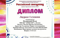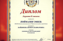 Ещё одна победа в копилку талантливого и многогранного учащегося отделения духовых и ударных инструментов ДМШ20, на этот раз успех в Oлимпиаде по сольфеджио Международного конкурса - фестиваля! Так держать, Поймалин Эмиль - Лауреат II ст., преп. Байбикова В.Н., так же учащиеся класса преп. Байбиковой В.Н. - Ахметшин Р. - Лауреат I ст., Рафикова Д. - Лауреат I ст., Ахмадишин И. - Лауреат II ст., Кадырова А. - Лауреат II ст., Талдыкина а. - Лауреат II ст., Закиров К. - Лауреат III ст., Белова П. - Дипломант I ст.