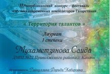 Мухаметзянова Саида - лауреат 2 степени, преподаватель Гайнуллина Фарида Кабировна;