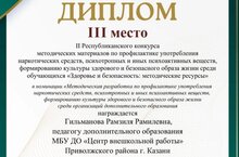 Подведены итоги II Республиканского конкурса «Здоровье и безопасность: методические ресурсы». Педагог дополнительного образования Гильманова Рамзиля Рамиловна приняла участие и награждена дипломом - III место, в номинации «Методическая разработка по профилактике употребления наркотических средств, психотропных и иных психоактивных веществ, формированию культуры здорового и безопасного образа жизни среди организаций дополнительного образования».