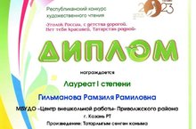 Подведены итоги Республиканского конкурса художественного чтения «Уголок России, с детства дорогой. Нет тебя красивей, Татарстан родной». Педагог дополнительного образования Гильманова Рамзиля Рамиловна приняла участие и награждена дипломом Лауреат 1 степени.