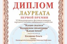Обучающаяся "Центра внешкольной работы" Косарева Ольга (руководитель Элеонора Ринатовна Калашникова) награждается дипломом лауреата первой премии VI Международного фестиваля-конкурса народного песенно-танцевального искусства "Казан cөлгесе", "Казанское полотенце"