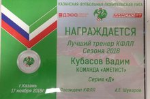Тренер по футболу Кубасов В.О. награжден как "Лучший тренер КФЛЛ Сезона 2018" Казанской футбольной любительской лигой. Поздравляем!