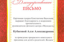 Директор Детского (подросткогого) центра Алла Александровна Кубасова и педагоги были награждены благодарственными письмами от Картинной галереи К.Васильева за проведение прекрасного новогоднего праздника для детей и родителей.