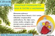 С 23 по 30декабря в ДПЦ "Молодость" пройдет новогоднее интерактивное представление "Смеятся разрешается или в гостях у Несмеяны" для детей с 2-х до 11 лет. Вас ждут песни, танцы, загадки, конкурсы, игры, мастер-классы, угощение от Несмеяны и конечно Дед Мороз и Снегурочка!