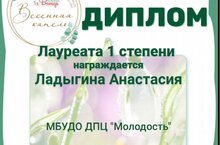 По итогам Открытого Всероссийского конкурса художественного творчества «Весенняя капель» учащаяся объединения "Палитра идей" (педагог - Ермакова А.С.) в номинации "живопись" стала Лауреатом 1 степени. Поздравляем!
