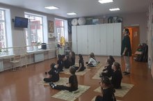 Педагог дополнительного образования Блашенкова Т.А. провела мастер-класс по каратэ "Вадо-кай" для детей младшего возраста 7-9 лет на тему: "Ката". Мастер-класс начался с разминки и продолжился выполнением акробатического упражнения "кувырок вперед".