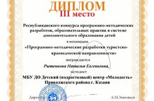 Методист ДПЦ "Молодость" Рытенкова Н.Е. приняла участие в Республиканском конкурсе программно-методических разработок, образовательных практик в системе дополнительного образования детей в номинации "Программно-методические разработки туристско-краеведческой направленности", где заняла III место. Поздравляем и желаем дальнейших успехов!