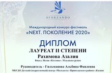 По итогам Международного конкурса "NEXT. ПОКОЛЕНИЕ 2020" в номинации "Вокал, младшая группа" Рахимова Азалия (объединение "Вокальный ансамбль "ДоРеMix", педагог дополнительного образования Гильманова А.Ф.) стала Лауреатом II степени. Поздравляем!