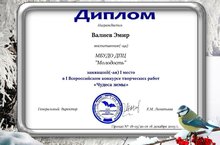 В всероссийском конкурсе творческих работ "Чудеса зимы" Валиев Эмир (объединение "Палитра идей", педагог дополнительного образования Валиева Н.Н.) занял I место. Поздравляем!