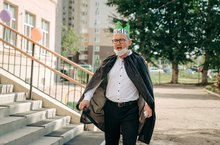 -костюм: пиджак, классические брюки, туфли. Цвет костюма: синий.