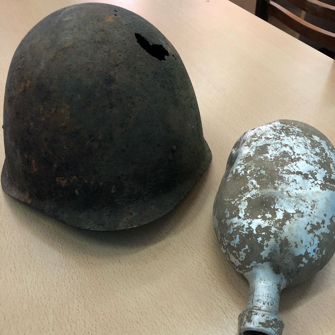 Это советская каска СШ -40 на которой видно, было пулевое ранение в голову и фляжка. Всё это принадлежит неизвестному солдату.????