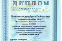 Воспитатель детского сада Хидиятова Альбина Рафилевна приняла участие в городском смотр-конкурсе среди воспитателей и дошкольных образовательных организаций г. Казани по профилактике детского дорожно-транспортного травматизма "Зеленый огонек", где награждена дипломом 3 место.