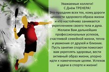 С Днем ТРЕНЕРА! 30.10.2017 Уважаемые тренеры! Вы – гарантия здоровья и благополучия молодого поколения. За вашими спинами сотни спортивных судеб. Для некоторых вы стали самыми близкими людьми. Спасибо, что делите со спортсменами радость побед и горечь поражений. Вам хорошо известно, что тяжелый труд и упорство приближают и подслащают победу. Успехи ваших воспитанников – это в первую очередь ваше достижение. Спасибо за труд и верность спорту! Здоровья, благополучия, успехов. Больше моментов истинной тренерской радости и личного счастья.