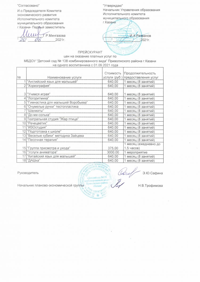 Прейскурант цен на оказание платных услуг МБДОУ "Детский сад №138" с 01.09.2020 года