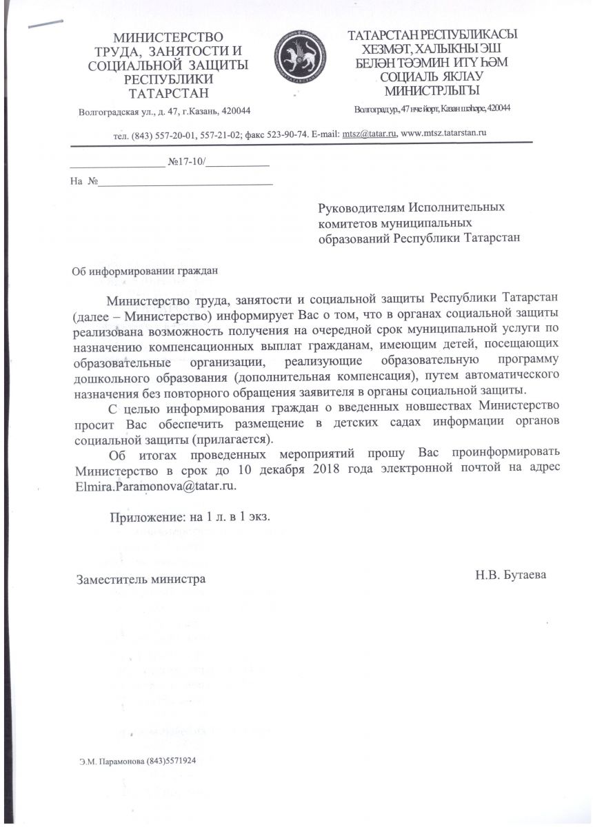 Министерство труда, занятости и социальной защиты РТ информирует о вас о том, что в органах социальной защиты реализована возможность получения на очередной срок муниципальной услуги по назначению компенсациионных выплат гражданам, имеющих детей, посещающих образовательные организации реализующие образовательную программу дошкольного образования, путем автоматического назначения без повторного обращения заявителя в органы социальной защиты.