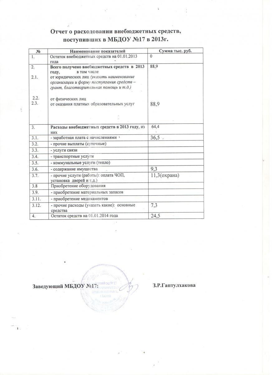 Отчет о привлечении и расходовании внебюджетных средств, поступивших в МБДОУ №17 в 2017г.