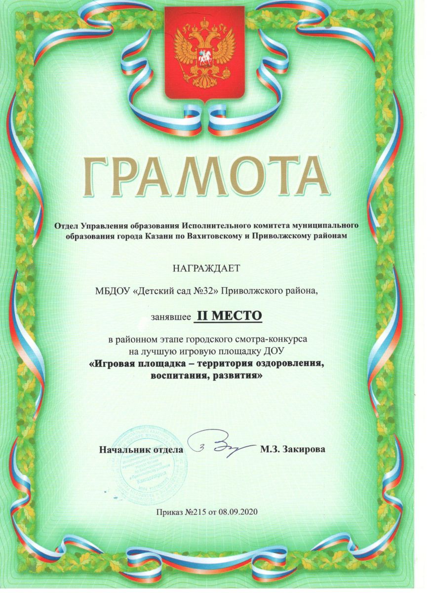 Нашему детскому саду были вручены грамоты - победитель номинации "Лучший детский сад года по итогам 2019-2020 года" и грамота - 2 место в районном этапе городского смотра-конкурса на лучшую игроваю площадку ДОУ.