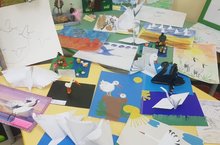 была организована тематическая выставка воспитанниками старших групп"Летят журавали".