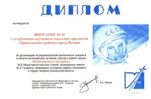 С 9 по 11 марта 2015 года на родине первого космонавта в г. Гагарин Смоленской области состоялись XLII Международные общественно-научные чтения, посвящённые памяти Ю.А. Гагарина, организованные Министерством культуры РФ, ФГБУ «НИИ ЦПК им. Гагарина», Российской Академии космонавтики им. К.Э. Циолковского.В секции «Профессия - космонавт» с докладом по теме «Формирование глобально-ориентированной образовательной среды для выявления кадрового потенциала школьников в области обеспечения космических полётов» выступили: директор школы № 35 Глухарёва Е.В., заместитель директора Кузьмина И.А., учитель биологии Кузьмина К.И. и учитель физики Григорьев И.П. В секции «Космонавтика и молодёжь» со стендовым докладом «Выращивание растений в условиях микрогравитации» выступила ученица 9 Б класса Шарафиева Камиля. За организацию исследовательской деятельности учащихся в области космонавтики Школа № 35 была награждена Дипломами. -