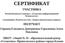 Как защитить личную информацию в Интернете? Что можно выкладывать в социальных сетях? Обсудили с учениками 10а класса и участвовали в республиканском конкурсе безопасности в сети «Галактика информационной безопасности» в номинации - лучшая памятка на тему «Персональные данные». Данный проект учрежден организацией «Управление информационной безопасности» при поддержке Министерства образования и науки Республики Татарстан. Каждый участник получил именной сертификат.