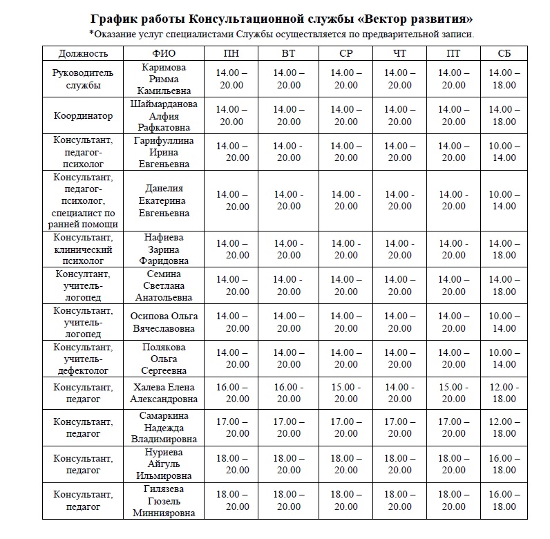 Оказание услуг специалистами Службы осуществляется по предварительной записи лично (по адресу: г. Казань, ул. Ш.Усманова, д. 25Б МБОУ «Школа №65» Московского района), по телефону (+79270384554).