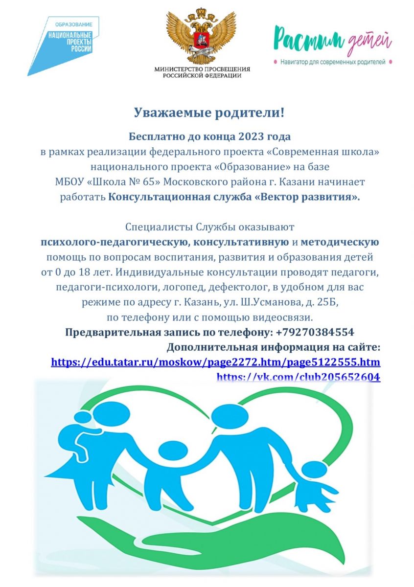 Опубликовано: 04.04.2023В рамках реализации федерального проекта «Современная школа» национального проекта «Образование» на базе МБОУ «Школа №65» Московского района г.Казани начала работать Консультационная служба «Вектор развития» (далее – Служба). Работа Службы будет организована до конца 2023 года, помощь оказывается на безвозмездной основе.