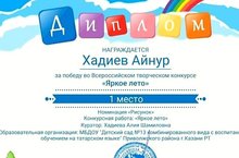Поздравляем нашего воспитанника ХАДИЕВА АЙНУРА (9 группа ) с победой во Всероссийском творческом конкурсе "ЯРКОЕ ЛЕТО".Желаем ему дальнейших творческих успехов.Воспитатели Сафина Айгуль Наркисовна,Мухутдинова Рания Рубисовна.
