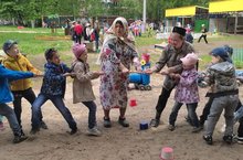 Торжество открыли стихами и песнями “Сабантуйга барабыз”, “Сабантуй бәйрәме”. Дети играли в татарские народные игры, участвовали в таких конкурсах, как национальная борьба “Көрәш”, бег в мешках, разбивание горшка, перетягивание каната.