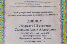 Воспитанница нашего детского сада Салахова Азиза Айдаровна 9 декабря 2018г. приняла участие в международном конкурс-фестивале речевого и вокального искусства "Илһамият" и заслуженно получила диплом Лауреата III степени. Мы гордимся нашей воспитанницей!!!