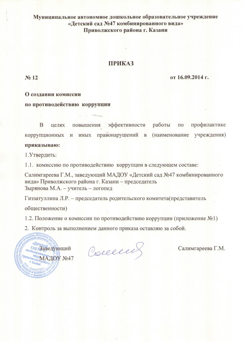 приказ по коррупции по МАДОУ "Детский сад № 47"