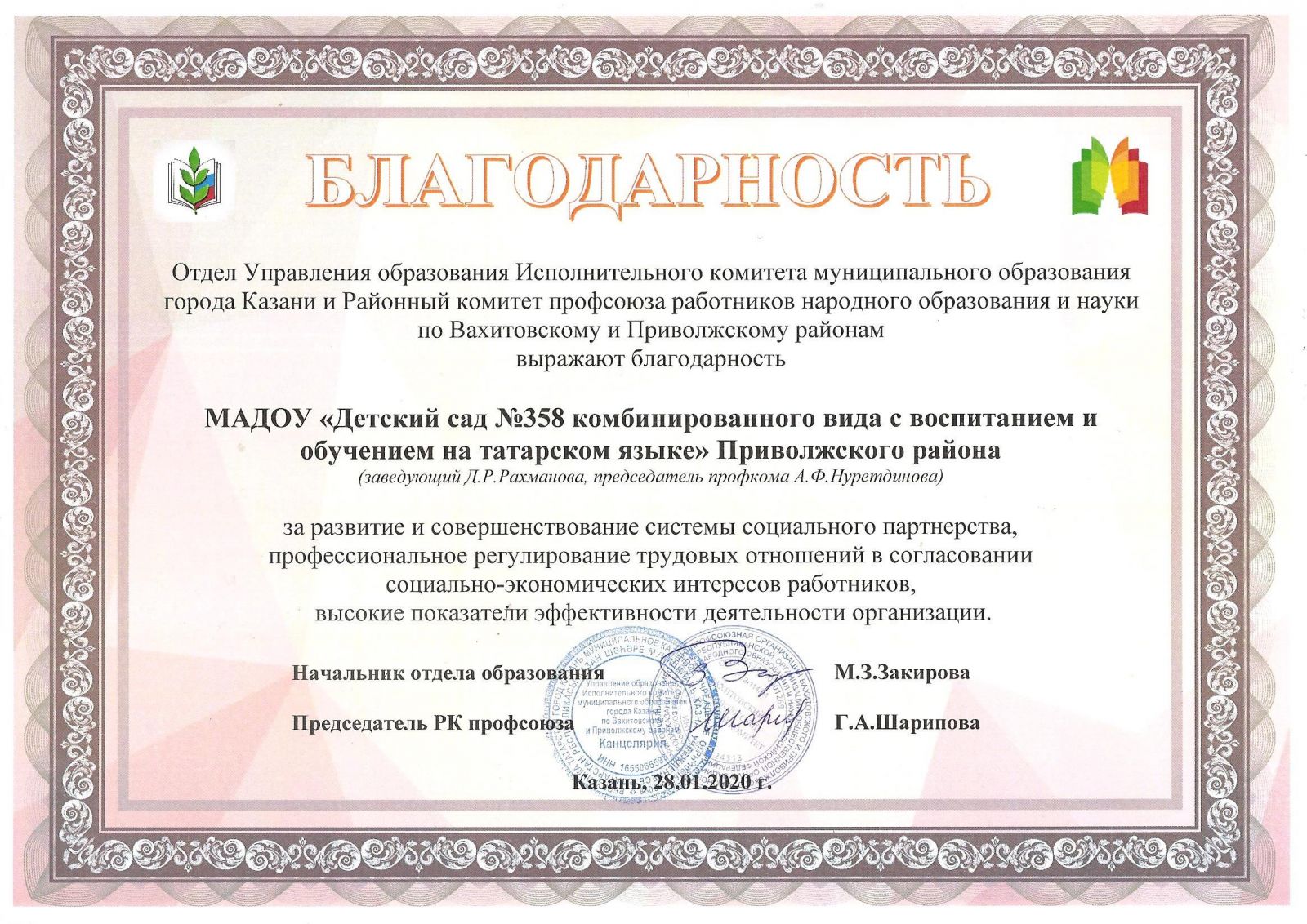 Опубликовано: 30.01.2020Наш детский сад показал высокий уровень эффективности деятельности и отмечен Благодарственным письмом за развитие и совершенствование системы социального партнерства, профессиональное регулирование трудовых отношений в согласовании социально-экономических интересов работников.