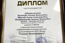 Подведены итоги городского смотра-конкурса информационно-социальных роликов среди ДОУ г.Казани "5 минут безопасности" по профилактике ДДТТ. В конкурсе приняли участие более 200 детских садов г. Казани!!! Видеоролик представленный творческой группой "Стрекозы" признан лучшим в городе и удостоен 1 места!!! "Стрекоза" вперед!!!