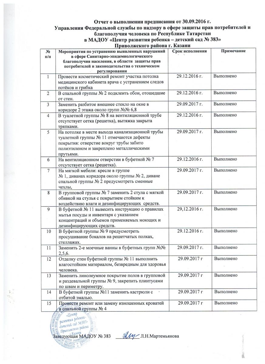 Отчет о выполнении предписания от 30.09.2016
